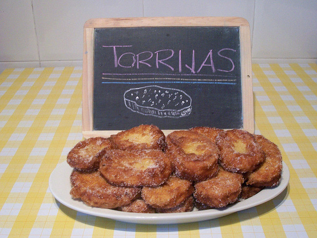 Este es quizás el plato más famoso y popular en Semana Santa. Las torrijas son rebanadas de pan bañadas en leche y que, una vez han absorbido toda la leche, son mezcladas con huevo para ser fritas posteriormente. Mucha gente compara las torrijas con las tostadas francesas, aunque las torrijas tienden a ser más dulces y son servidas como postre.